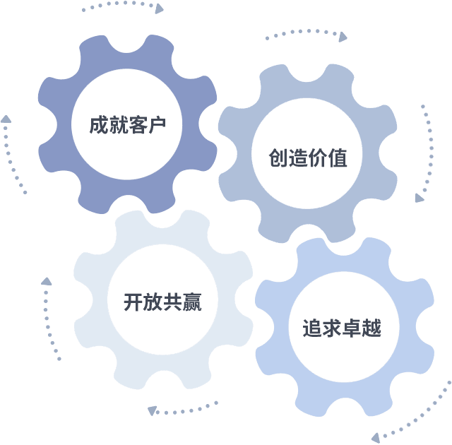 成就客户是一切决策的出发点,,,,创造价值是衡量所有工作的标准,,,追求卓越是我们做事做人的态度,,,开放共赢是我们的格局也是最终的结果。。。。价值观的齿轮环环相扣,,,推动着组织里的每个人不断向前。。。