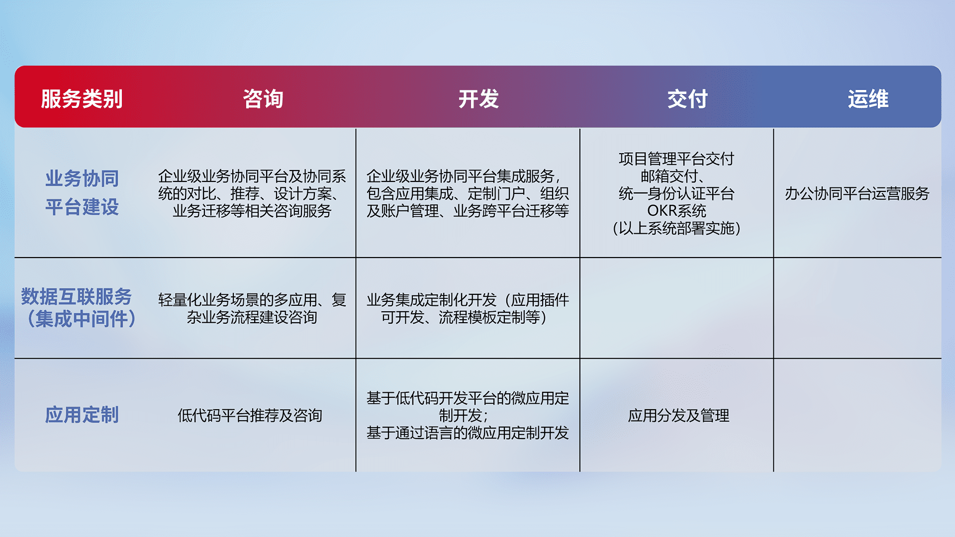 针对钉钉、、、、企微、、、IDaas等平台级产品提供产品的规划、、、方案、、、交付、、、定制化开发等服务,,,,实现如统一协同办公、、、智能客户服务、、、混合会议管理、、、、智能数据查询、、、、等业务场景,,,,实现数字化转型。。。