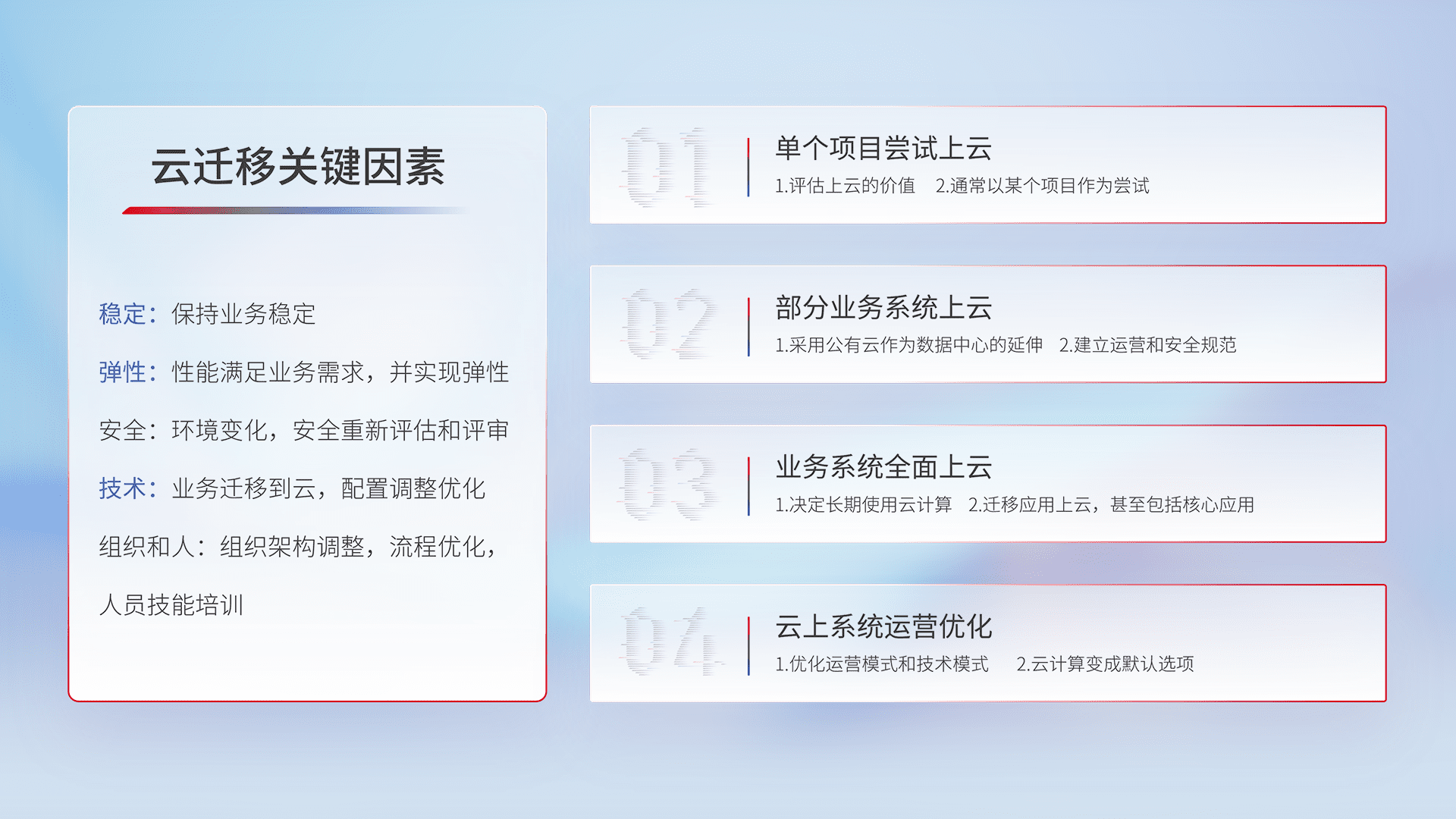 结合实际业务,,,,从规划设计、、、、云平台选型、、、云原生改造、、数据迁移、、集成交付,,,,迁移全过程为客户识别最佳上云路径,,,,做好风险识别管理,,,,设计网络架构、、身份权限、、安全审计合规、、、操作审计、、、、日志审计、、、、监控告警策略、、、多站点容灾设计等,,对云上基础设施进行整体规划,,提升IT治理水平,,,以满足弹性、、高可用、、、、高性能的需求。。。。