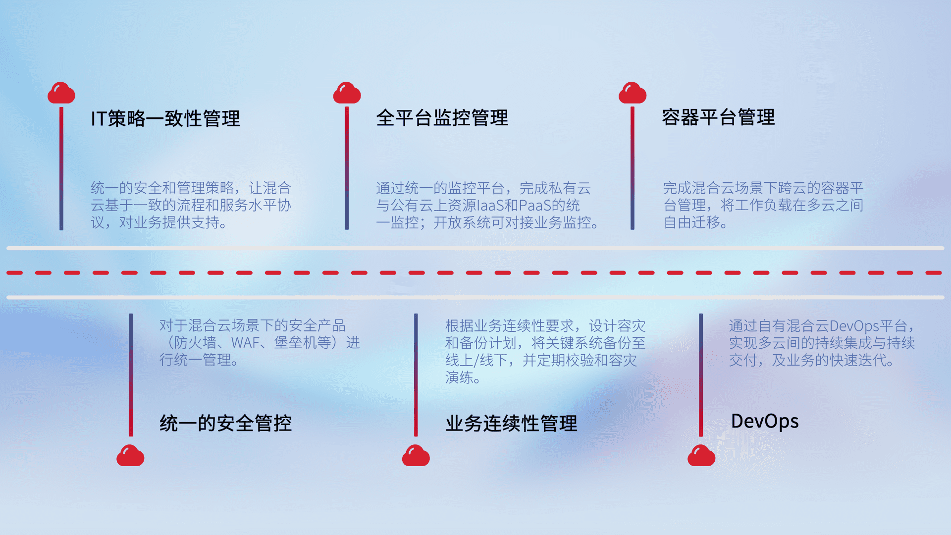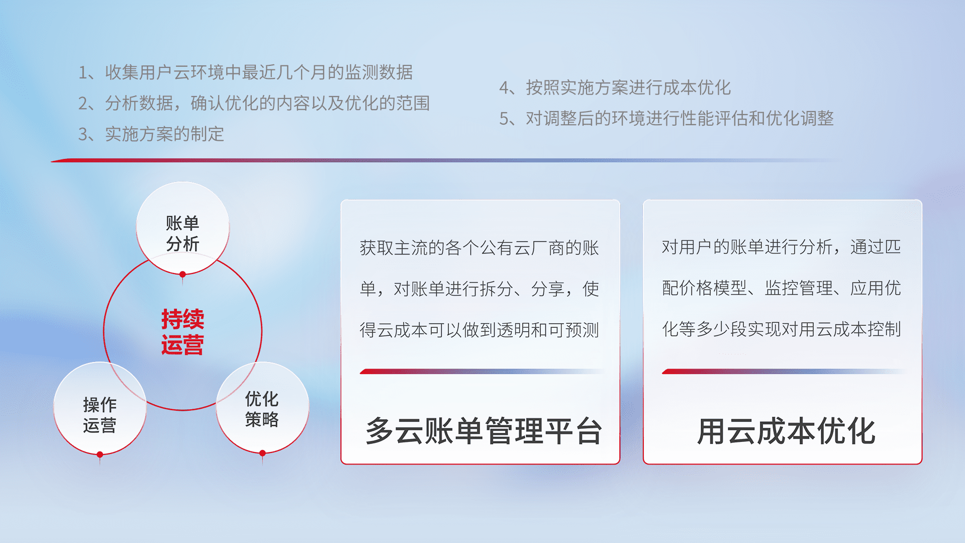 通过多云纳管,,,以统一的资源数据模型把客户的云资源进行抽象和封装,,,进而实现对多云资源的统一操作,,,,保障云资源管理的可靠性、、、稳定性与可用性。。。量身定制化运维内容,,,,配置、、、开发运维、、、、补丁管理、、、备份、、监控、、认证和访问管理、、、、审计和日常巡检等,,,保障在用云过程中的可靠度,,稳定度以及高可用率。。。。